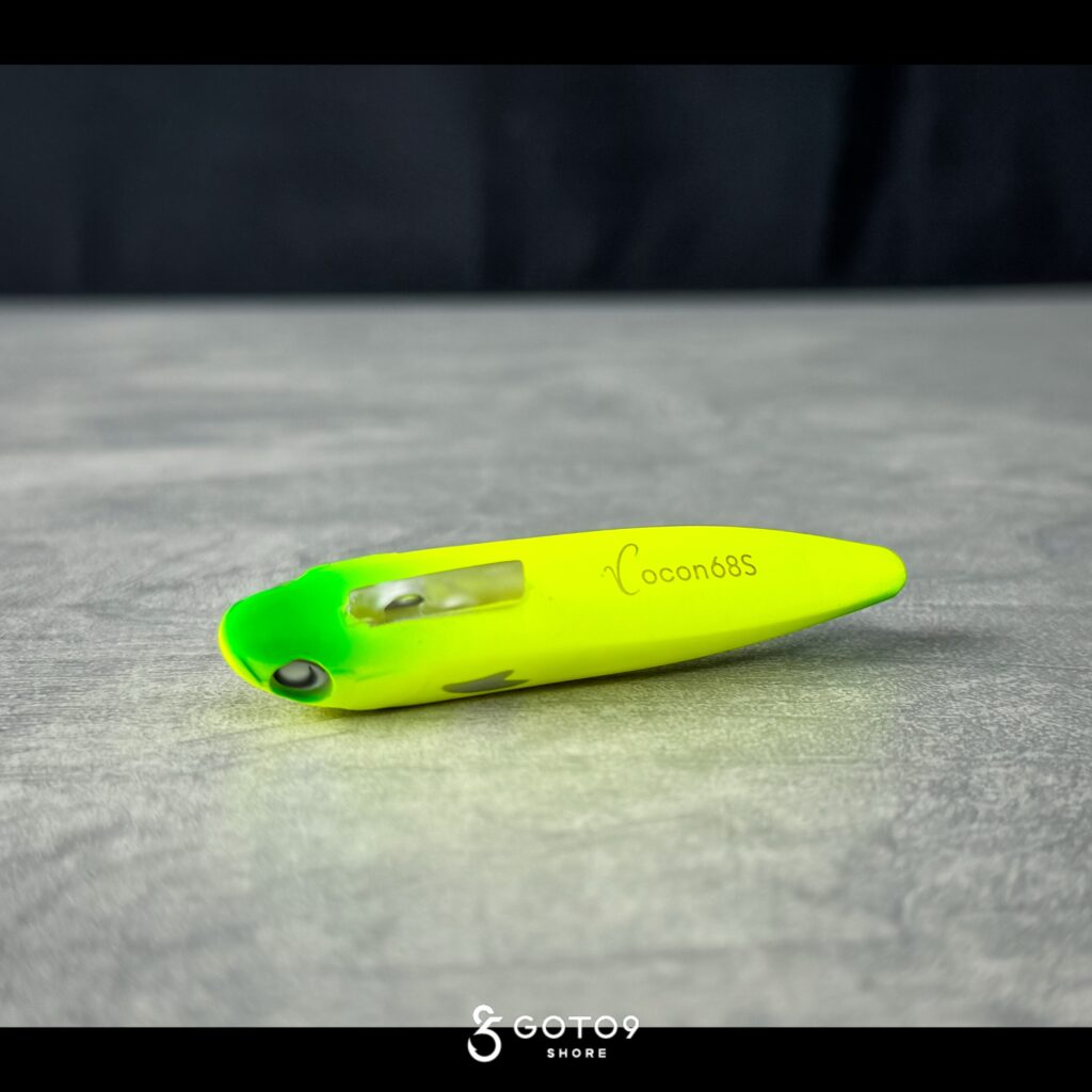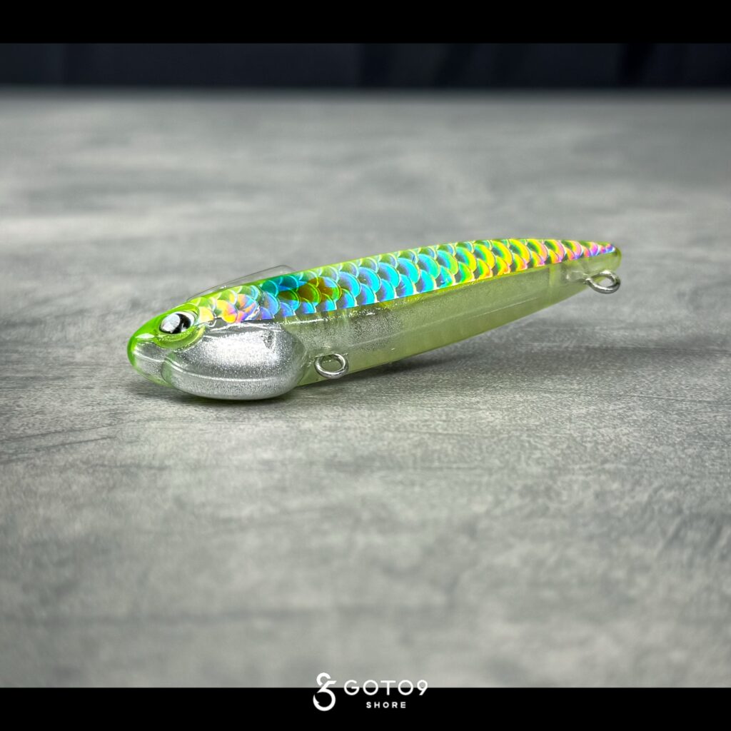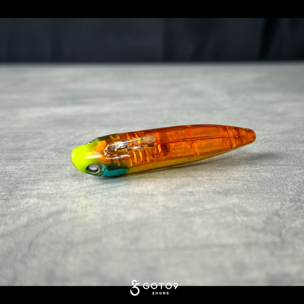 GOTO9では初採用のイナッコチャート。今回のプロトから使用されてきたテストカラーであり、吉田氏の96㎝をはじめ実績十分なため製品に採用されたカラー。03のイナッコとは対を成すポジションで、視認性を重視したホロ系カラー。