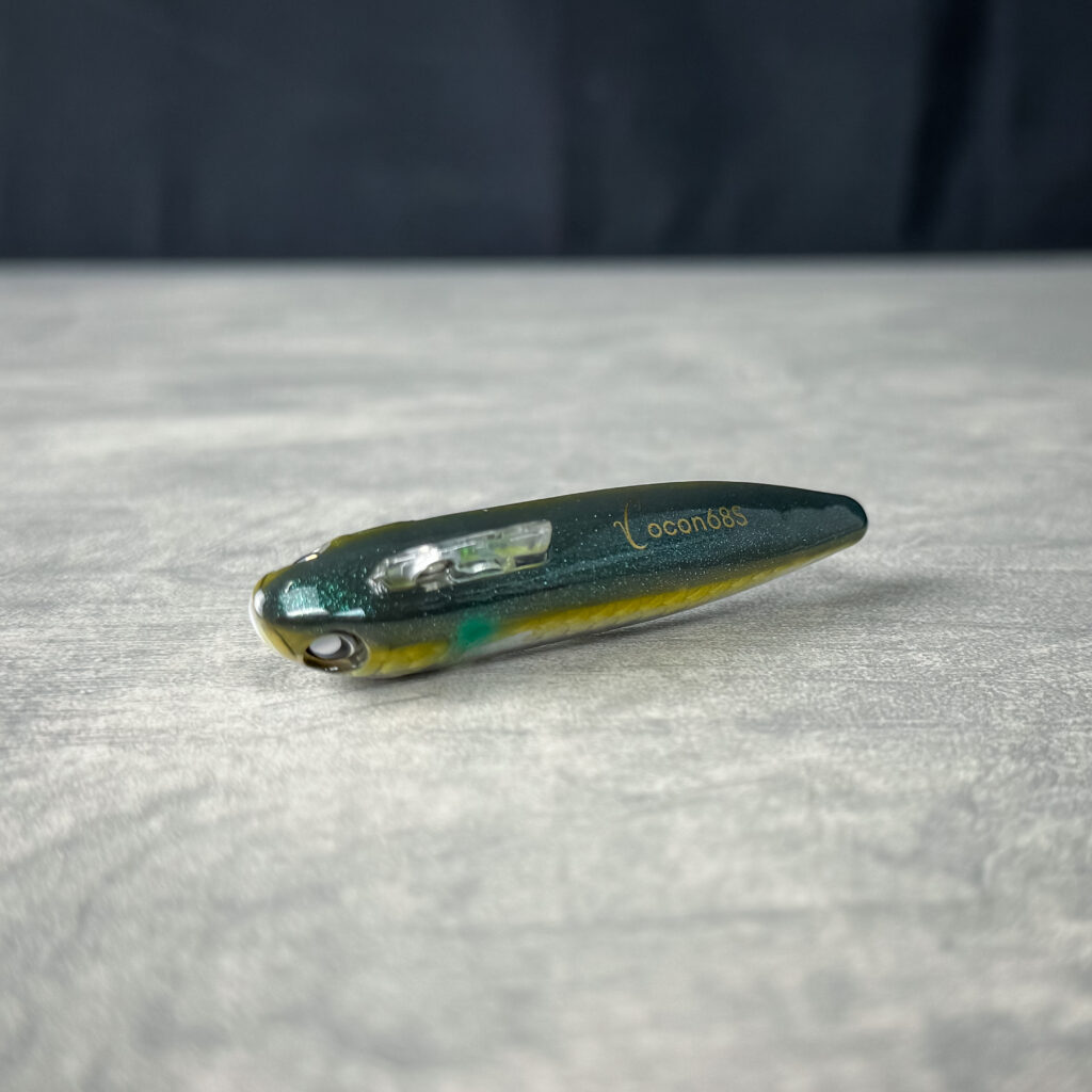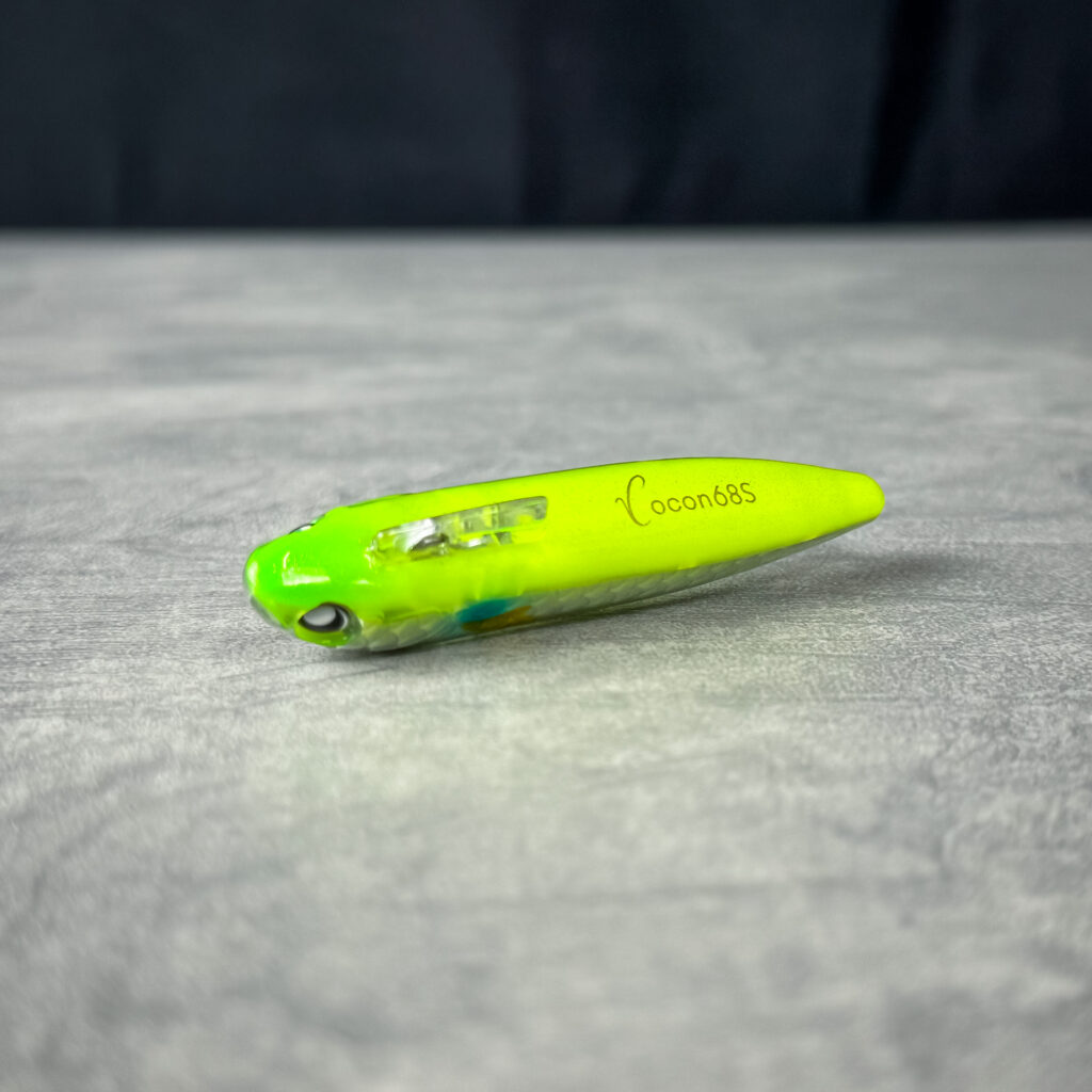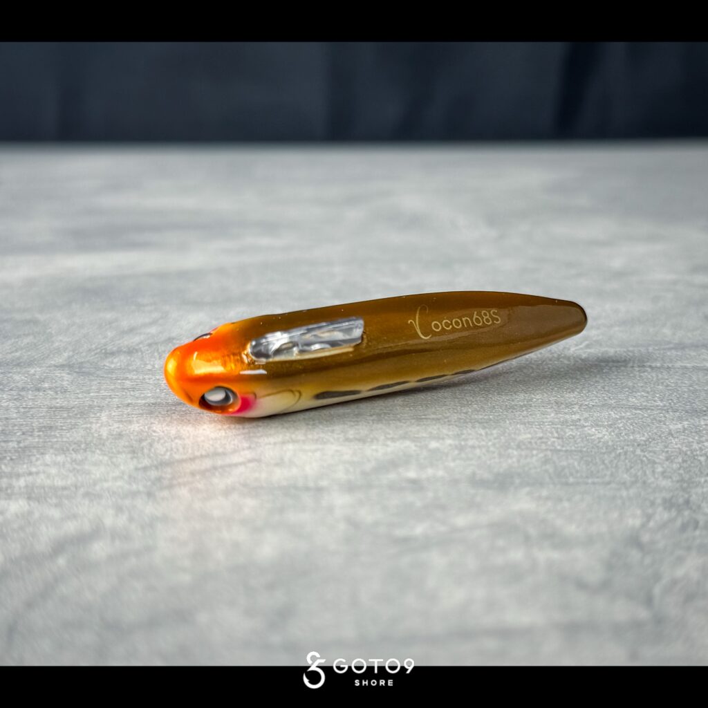 元来、清流シーバスのトップウォーターで使いたかったという経緯もあり、ルアーの位置や頭向きを把握する為に頭頂部のみをチャートにし、水に入る部分は目立ちにくいブラウン系×鈍い光のゴールドで仕上げている。ココンの場合であれば、運河や小規模河川で上から頭部をマーカー的に確認しながらトレース。後部にかけてはクリアオレンジのため水馴染みがよく、強めのシルエット・カラーが逆効果の場合に最適解となる。
