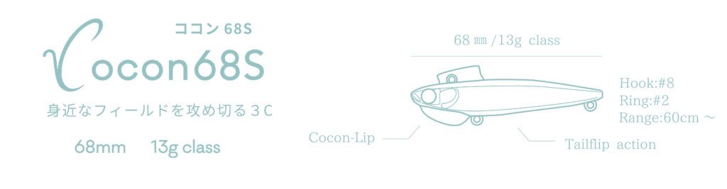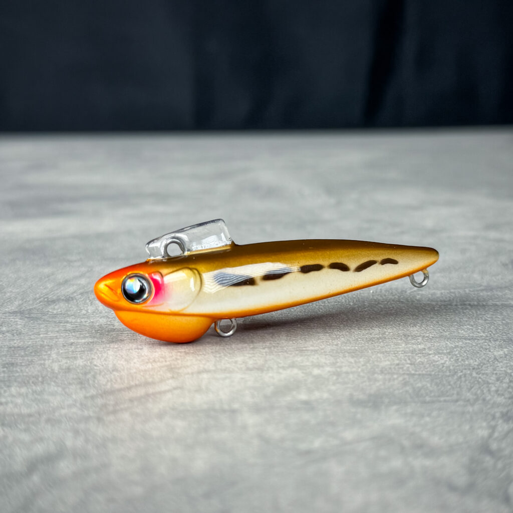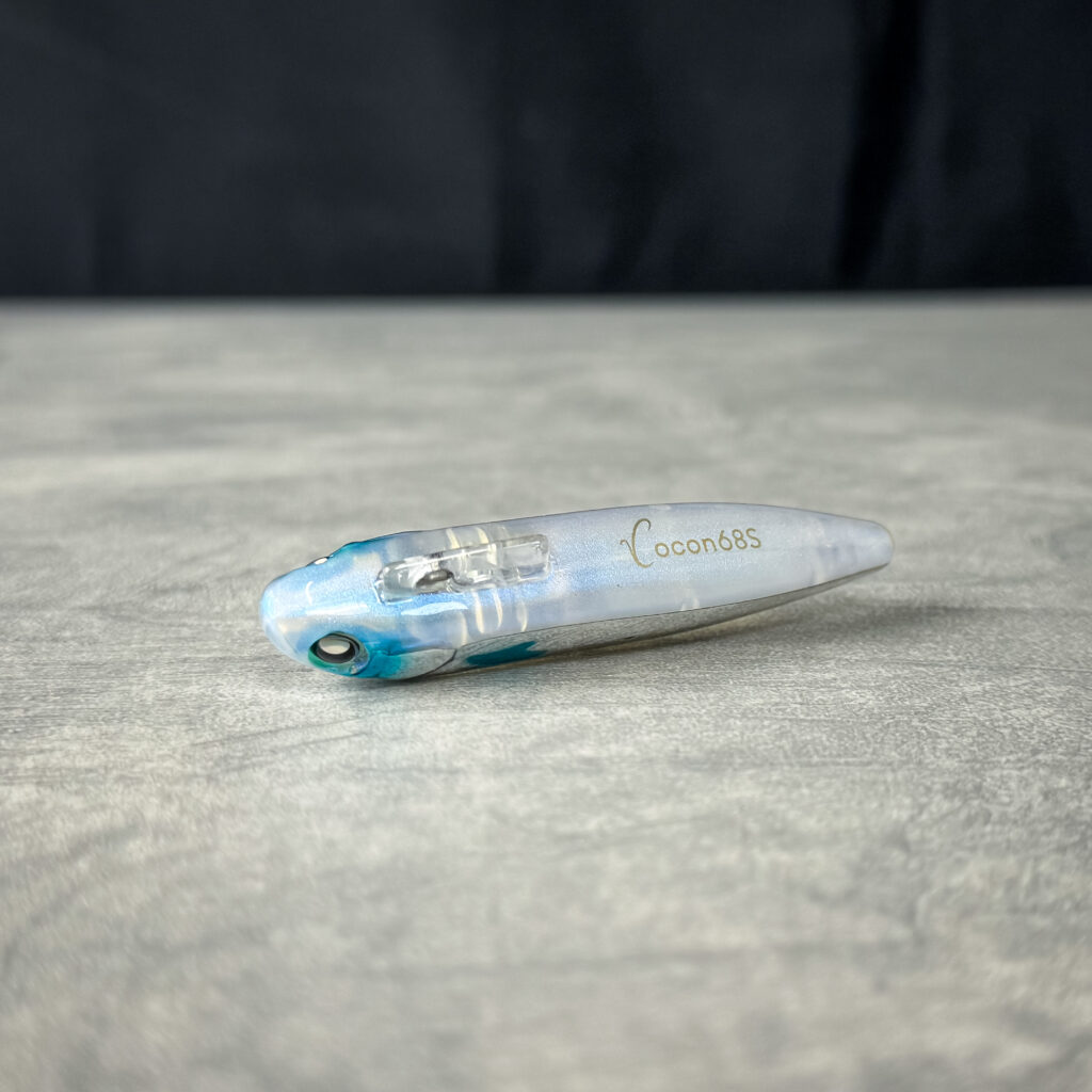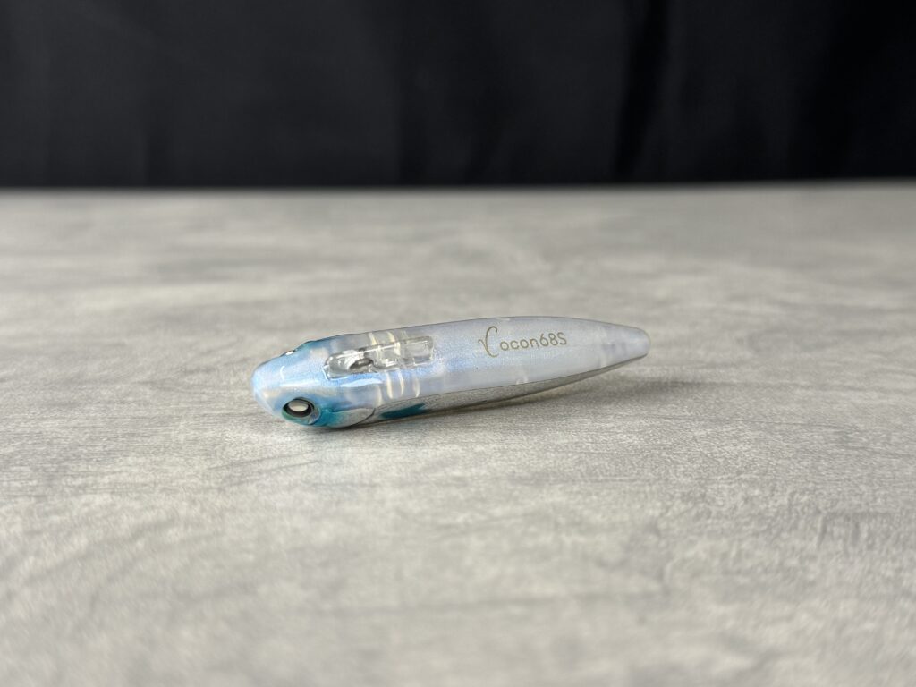元来、清流シーバスのトップウォーターで使いたかったという経緯もあり、ルアーの位置や頭向きを把握する為に頭頂部のみをチャートにし、水に入る部分は目立ちにくいブラウン系×鈍い光のゴールドで仕上げている。ココンの場合であれば、運河や小規模河川で上から頭部をマーカー的に確認しながらトレース。後部にかけてはクリアオレンジのため水馴染みがよく、強めのシルエット・カラーが逆効果の場合に最適解となる。